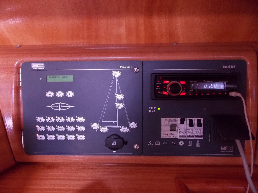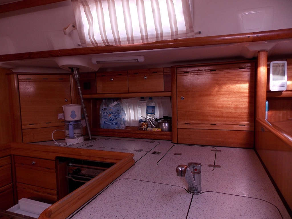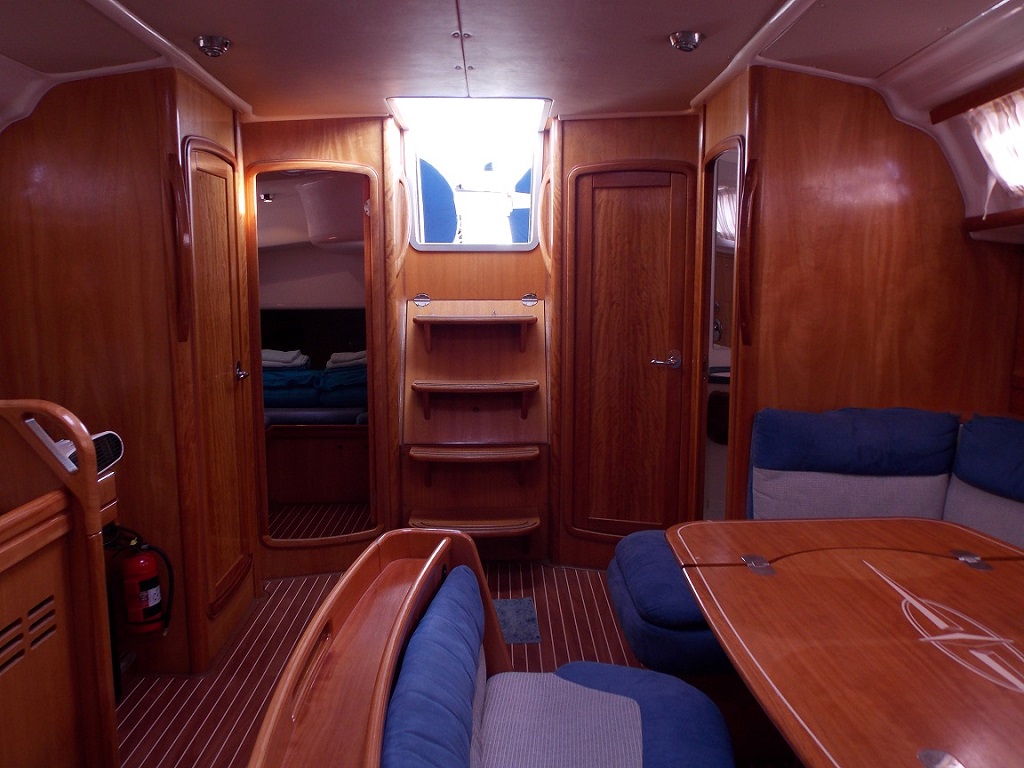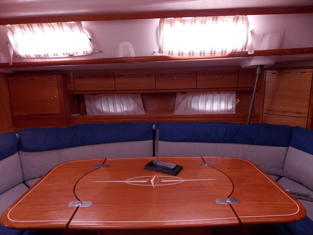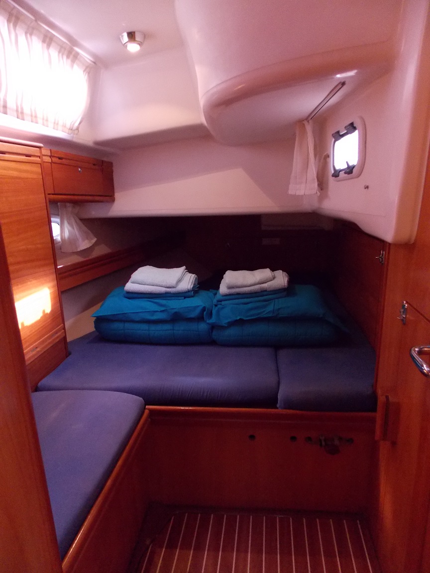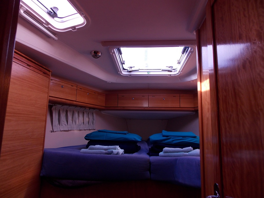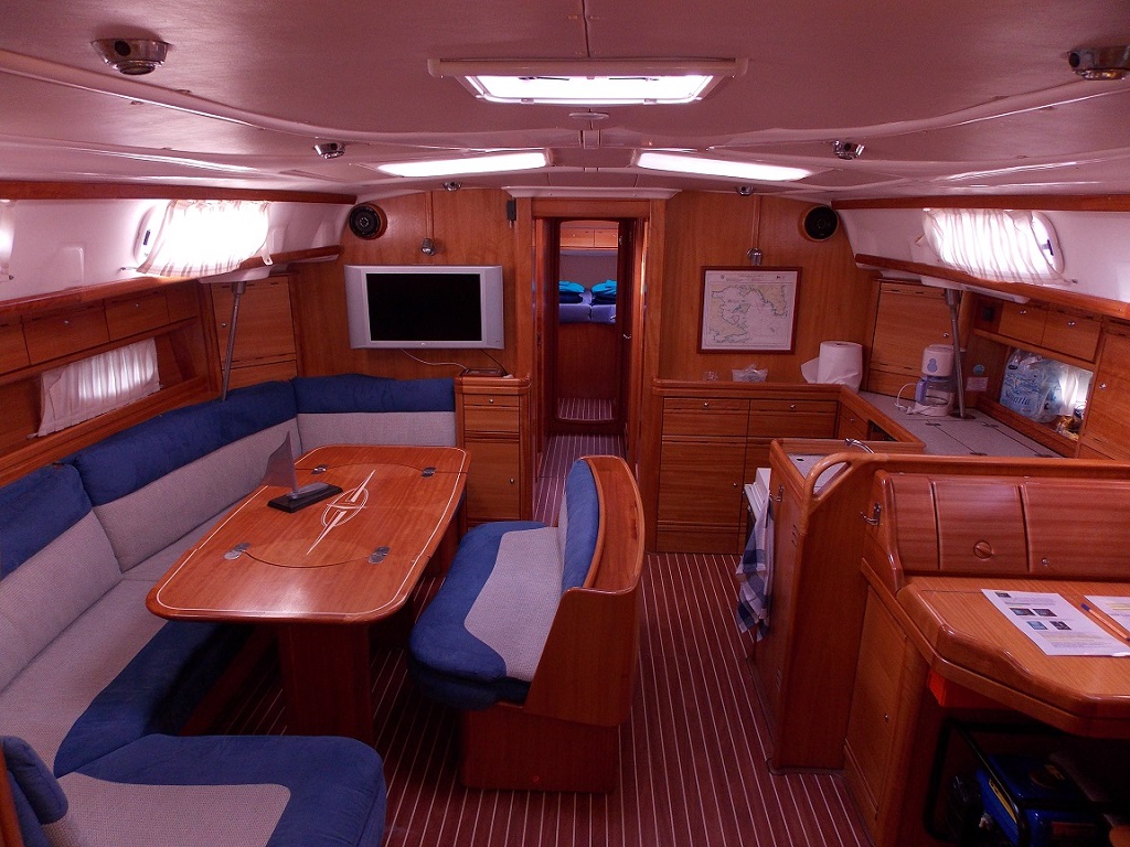 The Bavaria 50 Cruiser Almost Free is a large cruising yacht providing spacious and comfortable accommodation for a few small families, or a group of ten adults. The forward side cabins provide bunk beds which are popular with children. Almost Free can welcome ten people in five cabins. There is a cabin forward of the galley with two bunk beds, a shared head and shower opposite to starboard. A large cabin, that splits the V-berth in two, and a V-berth, are just aft of the deep chain locker in the bow. Below the decks, Almost Free is really spacious, with the salon laid out to entertain all passengers. The amply-sized table with U-shaped seating to starboard and an amidships bench could easily seat ten. The interior is well lit and airy, thanks to seventeen opening hatches and twelve ports, and comes with wood and sole options that range from light-colored ones to dark chestnut. There is a chart table in front of the starboard heads with control panel, chart plotter, GPS, VHF radio and CD/radio player. The cockpit table has comfortable seats and is covered by a bimini tent. There are also external loudspeakers in the cockpit connected to the CD/radio. Almost Free can be managed by a crew of two, although at 50 ft a larger crew always makes mooring and other tasks simpler. She is equipped with twin-wheel steering, rolling genoa and in-mast furling mainsail plus a bow thruster, making maneuvering easier. She also includes a full teak deck, chart plotter and an inflatable dinghy with outboard engine. You can book Almost Free bareboat or with an experienced skipper. More: Hands Generator 3.kva, furling mainsail, laptop, dvd, wireless internet access on board, 3 electric toilets, inverter 12/220 (600 w, for laptop,cellphones...).